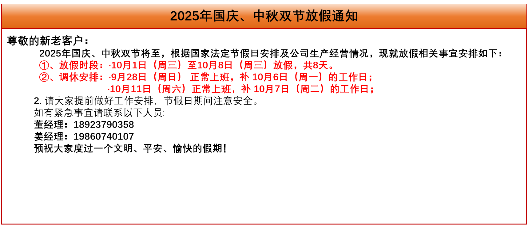 恒域威2025年国庆、中秋双节放假通知