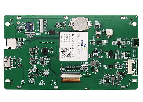 四、恒域威智能串口屏选型推荐 1. 选型推荐:遥控器自带TFT彩屏显示,显示支持中英文切换可选型尺寸恒域威E/F系列4.3-5.0-7.0-10.1 (定制都可满足)。 举例:HYW070FV1.2是一款7寸分辨率为 800*480 工业级组态串口屏。