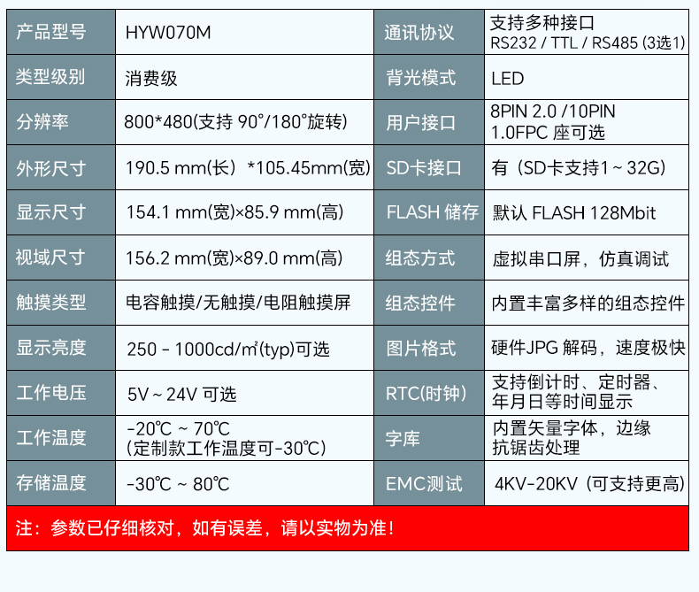HYW070M 7寸电容触摸、无外壳,通信支持RS232/TTL/485,超性价比款
