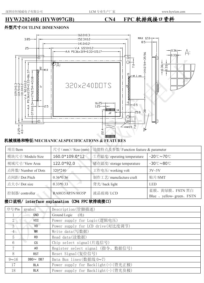 恒域威320240B图形点阵单色屏 带控负蓝底白字 工作电压3.3V